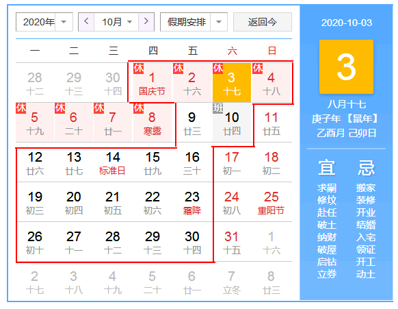 今年的中秋国庆双节同天,因此国家人力资源部早就宣布这个月的法定节假日是四天,也就是10月1~4日都是需要计薪的。虽然5日~8日也是放假,都是不算在计薪天数里面。10月10日虽然是星期六,但这天是需要补班,也是要纳入计薪的天数里面。因此,整个10月份的计薪天数如下图所示。